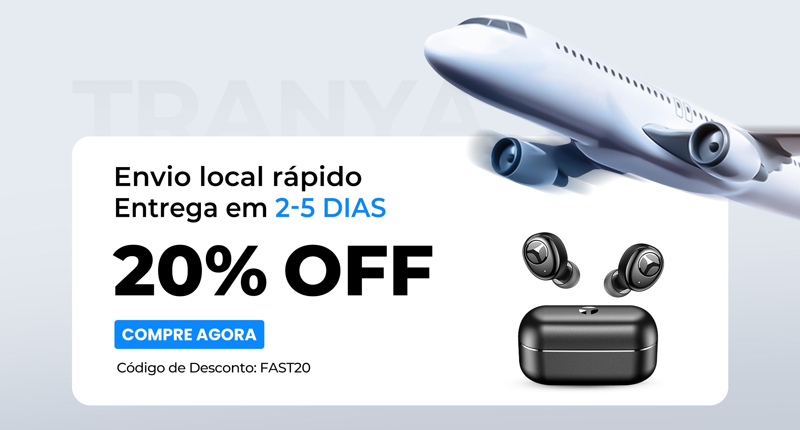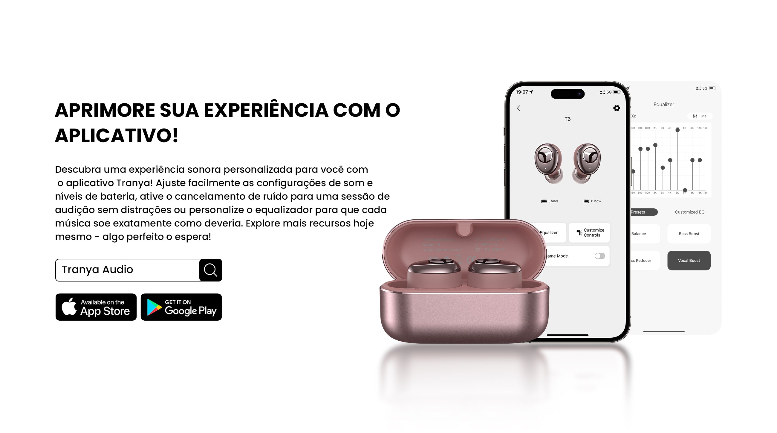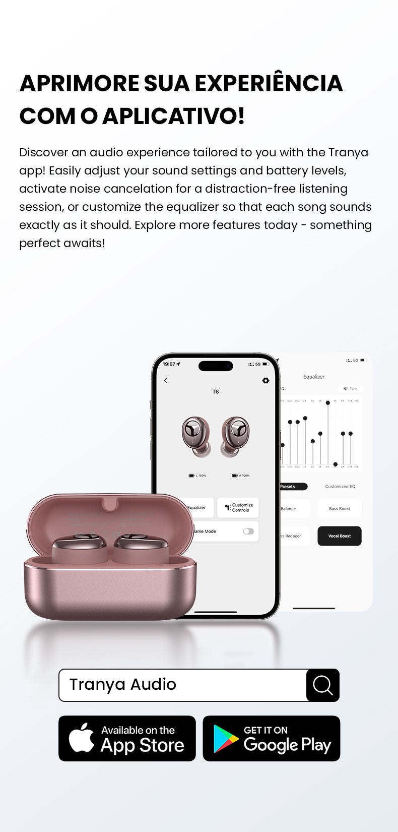 Tranya T6® Produto Original, Sem Taxas Alfandegárias, Frete Grátis, Certificado pela Anatel, Qualcomm QCC3040, Qualidade de Som Superior, Suporte a Aplicativo