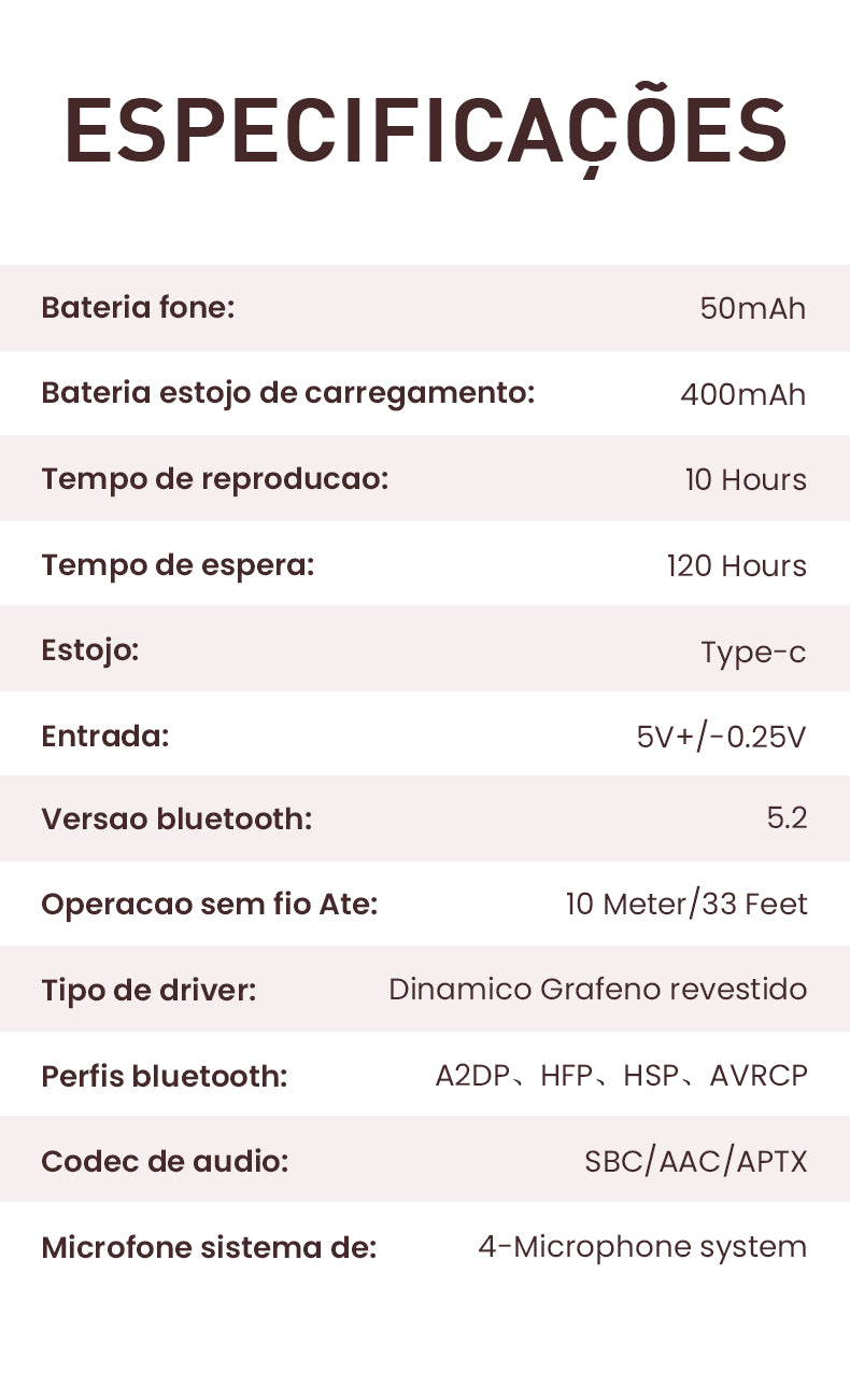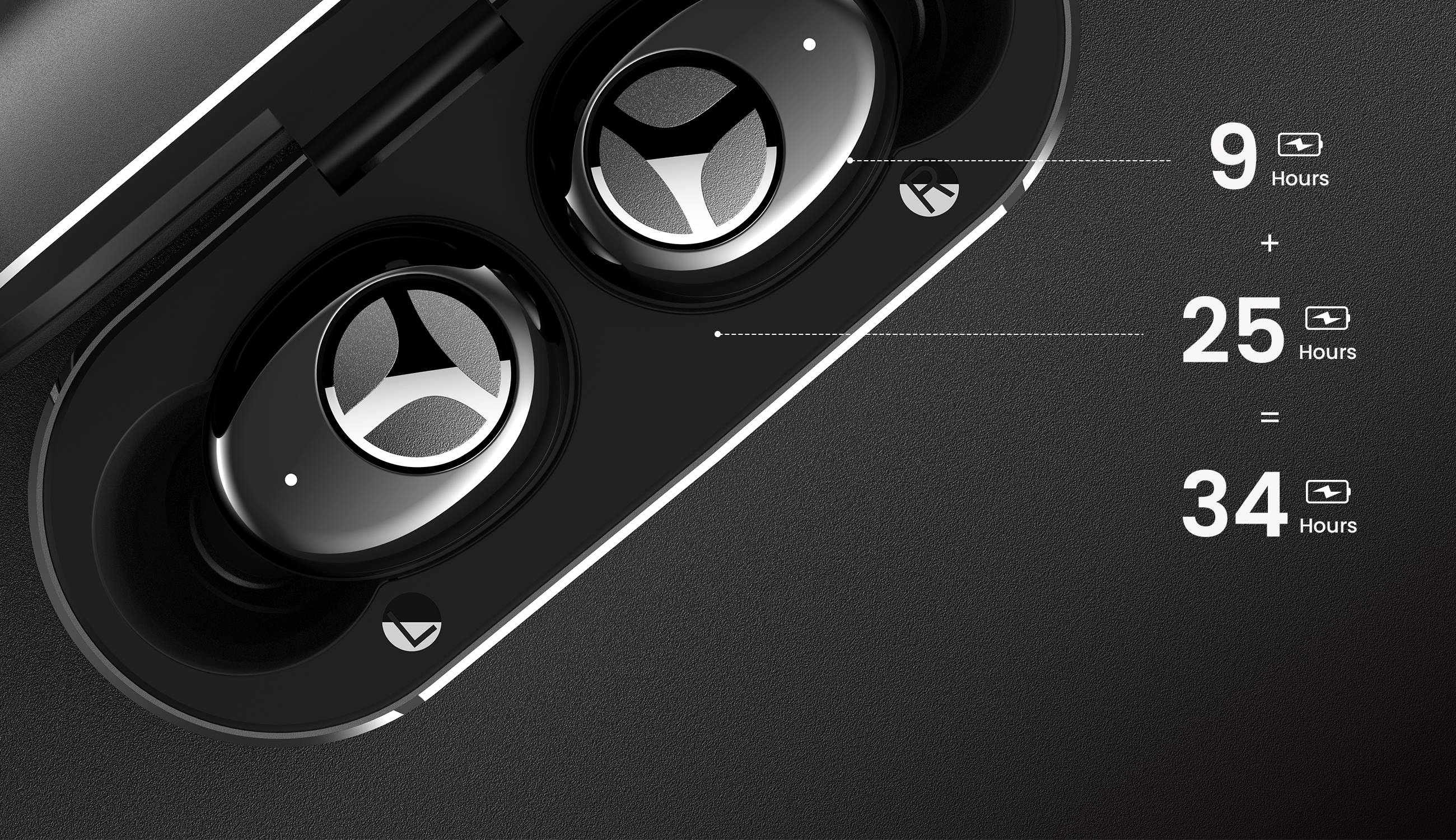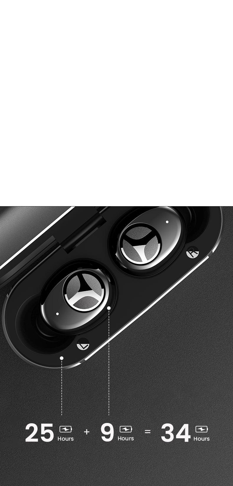 Tempo de reprodução de 34 horas: 9 horas + 25 horas com estojo de carregamento